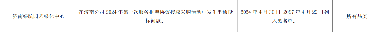 公告显示,济南绿航园艺绿化中心,在济南公司 2024 年第一次服务框架协议授权采购活动中发生串通投标问题。