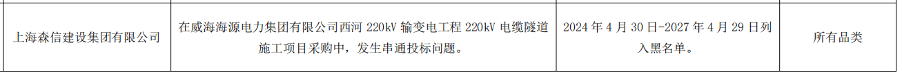 公告显示,上海森信建设集团有限公司,在威海海源电力集团有限公司西河 220kV 输变电工程 220kV 电缆隧道施工项目采购中,发生串通投标问题。