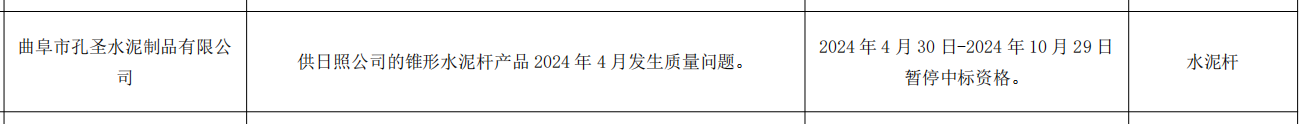 公告显示,曲阜市孔圣水泥制品有限公司,在供日照公司的锥形水泥杆产品 2024 年 4 月发生质量问题。