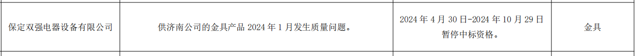 公告显示,保定双强电器设备有限公司,在供济南公司的金具产品 2024 年 1 月发生质量问题。