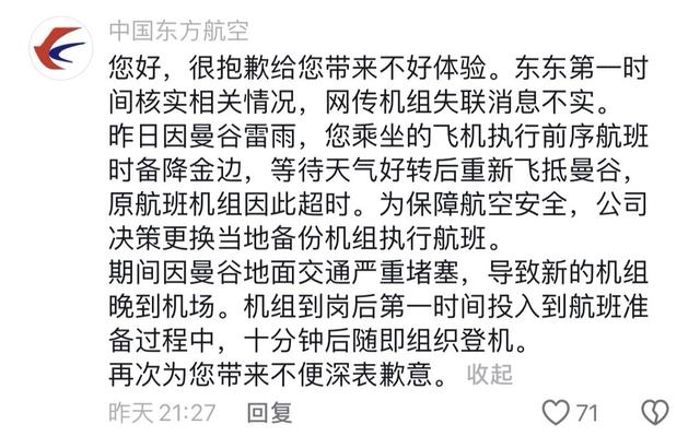 对此,5月14日晚,中国东方航空官方账号在“摆烂兔兔”的评论区回应:网传机组失联消息不实,因曼谷雷雨致乘坐的飞机执行前序航班时备降金边,等待天气好转后重新飞抵曼谷,原航班机组因此超时。为保障航空安全,公司决策更换当地备份机组执行航班。其间因曼谷地面交通严重堵塞,导致新的机组晚到机场。