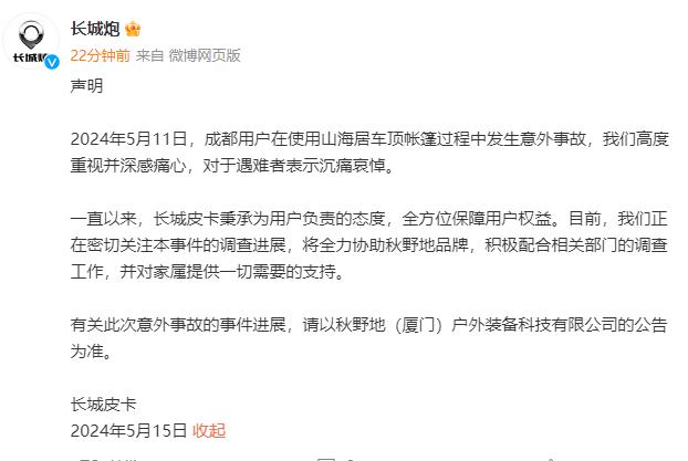 5月15日,@长城炮 发布声明:2024年5月11日,成都用户在使用山海居车顶帐篷过程中发生意外事故,我们高度重视并深感痛心,对于遇难者表示沉痛哀悼。一直以来,长城皮卡秉承为用户负责的态度,全方位保障用户权益。目前,我们正在密切关注本事件的调查进展,将全力协助秋野地品牌,积极配合相关部门的调查工作,并对家属提供一切需要的支持。有关此次意外事故的事件进展,请以秋野地(厦门)户外装备科技有限公司的公告为准。