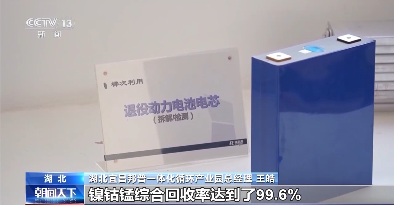 湖北宜昌邦普一体化循环产业园总经理 王皓:目前已实现锂回收利用率达91%以上,镍钴锰综合回收率达到了99.6%,对于铁、铜、铝及电解液、石墨等资源也可再生利用,实现绿色环保。