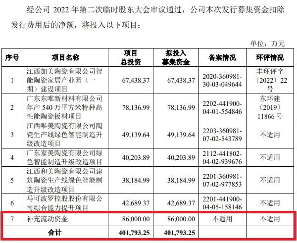 另外,在2022年5月递交主板IPO申请时,马可波罗预计募资40.18亿元,其中,8.6亿元用于补充流动资金,直到2023年6月28日更新的申报稿,都保有补充流动资金一项。