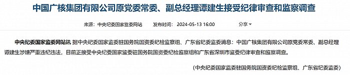 5月13日,中央纪委国家监委官网通报称,中国广核集团有限公司(下称中广核)原党委常委、副总经理谭建生涉嫌严重违纪违法,目前正接受中央纪委国家监委驻国务院国资委纪检监察组和广东省深圳市监委纪律审查和监察调查。