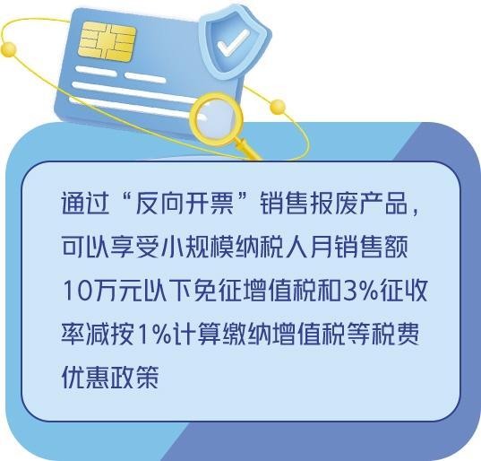 《公告》明确,自4月29日起,有“反向开票”意愿的资源回收企业,可向税务部门提交相关资料,履行完规定的简单程序后,可以第一时间便捷实现“反向开票”。出售者通过“反向开票”销售报废产品,可以享受小规模纳税人月销售额10万元以下免征增值税和3%征收率减按1%计算缴纳增值税等税费优惠政策。当前,各地税务部门积极推动“反向开票”工作有序开展,许多企业已及时享受到政策利好。