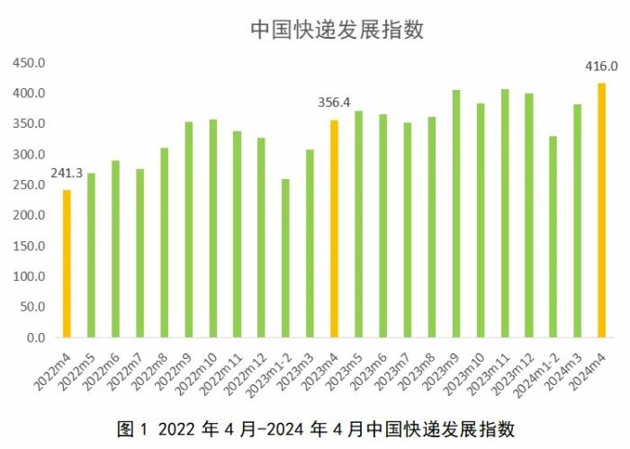 中新网5月13日电 据国家邮政局官方微信消息,经测算,2024年4月中国快递发展指数为416,同比提升16.7%。