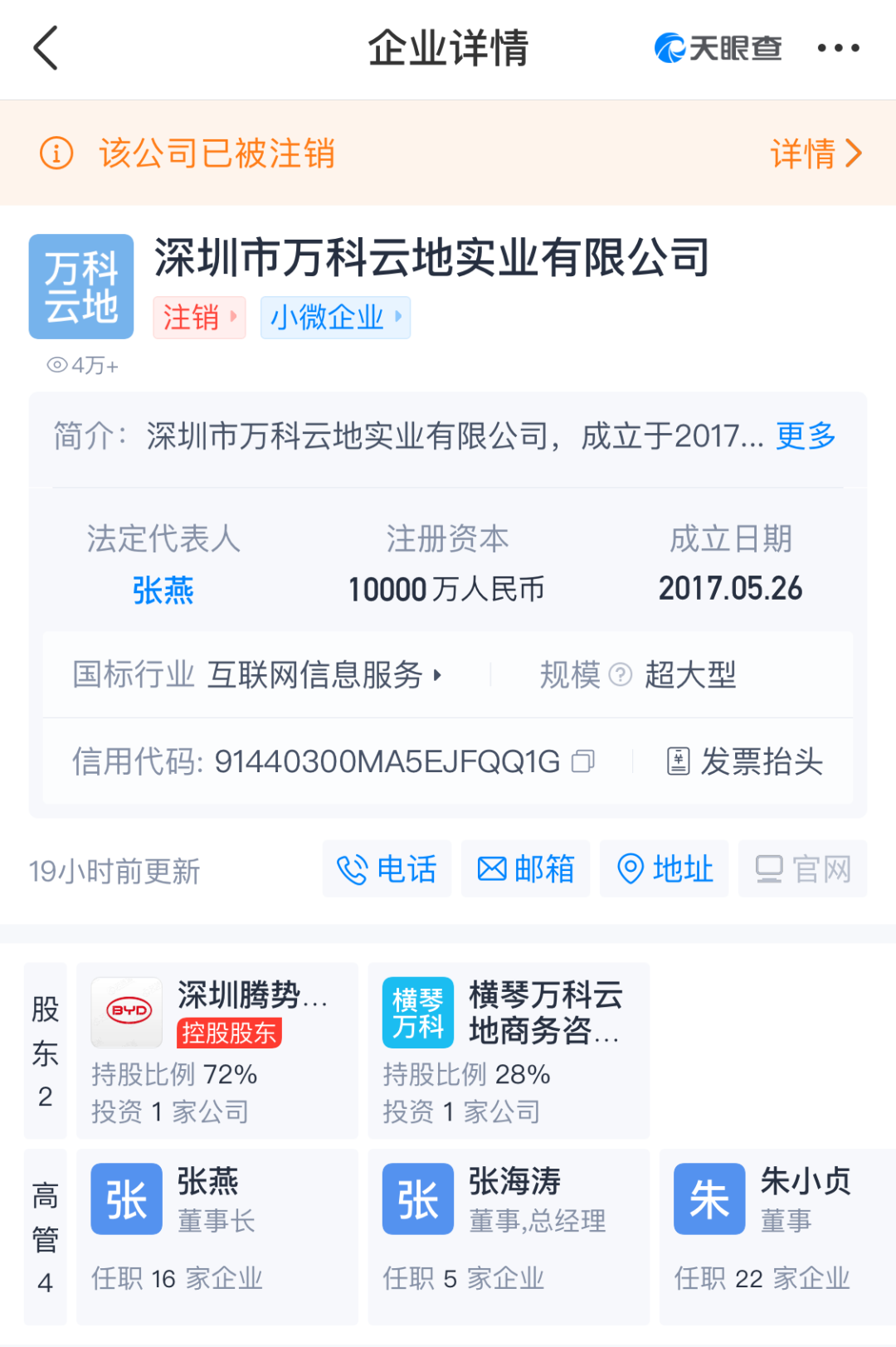 5月13日,天眼查App显示,近日,深圳市万科云地实业有限公司企业状态由存续变更为注销。该公司由比亚迪旗下深圳腾势汽车有限公司以及万科A旗下横琴万科云地商务咨询合伙企业(有限合伙)分别持股72%、28%。