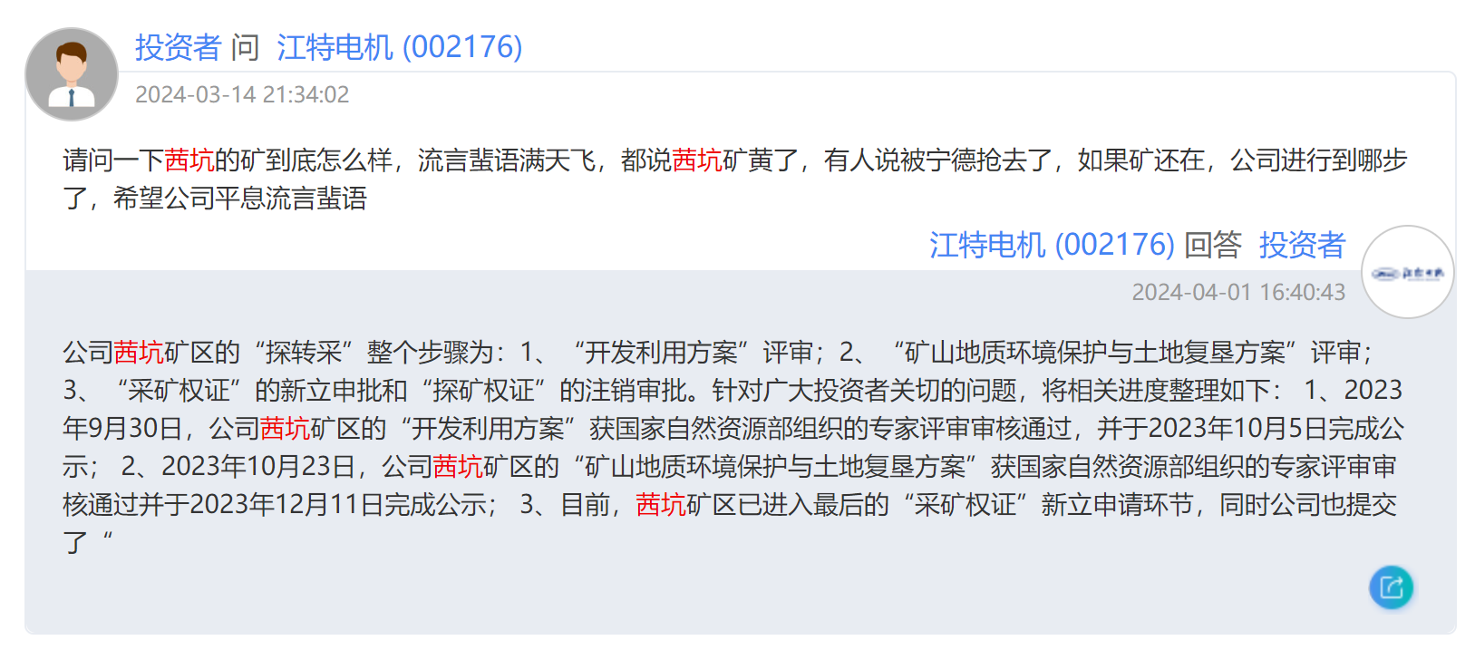 事实上,自江特电机2021年12月正式将茜坑探转采的探矿权分立及延续保留等材料提交到国家自然资源部审批,茜坑探转采的进程一直备受投资者关注。上个月,江特电机多次在互动平台回复茜坑采矿权办理的相关进展,彼时称茜坑矿区已进入最后的“采矿权证”新立申请环节,今日公告茜坑锂矿“探转采”尘埃落定,让投资者吃了“定心丸”。