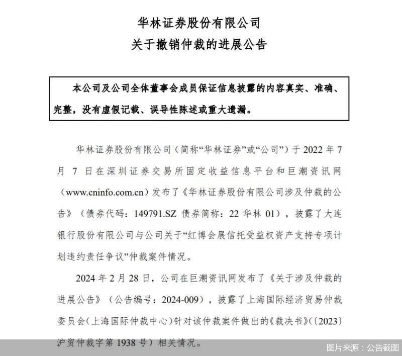 此前在2022年7月,华林证券披露了大连银行股份有限公司与公司关于“红博会展信托受益权资产支持专项计划违约责任争议”仲裁案件情况;并在2024年2月28日披露了上海国际经济贸易仲裁委员会(上海国际仲裁中心)针对该仲裁案件做出的《裁决书》相关情况;2024年3月19日,华林证券披露了公司向上海金融法院申请撤销裁决并获受理的情况。