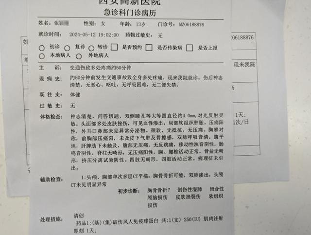 死者的女婿告诉记者:“我(12日)下午知道消息后去医院,抵达后岳母人已经不行了,岳父还在抢救但最后还是没救过来。我女儿现在还在住院,状态不是太好。”家属出具的西安高新医院门诊科病历显示,伤者张某某主诉交通伤致多处疼痛,辅助检查结果显示胸骨可能存在骨折,双肺渗出。段某的死亡证明显示,段某的死亡原因是失血性休克。