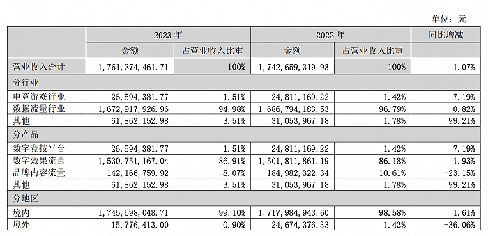 该公司的主营业务从产品角度分为数字效果流量、品牌内容流量、数字竞技平台和其他,其中占比最大的为数字效果流量业务。2022年和2023年,数字效果流量业务在公司总营收的占比均超过86%。
