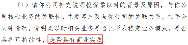 深交所要求公司补充说明投资柔以时的背景及原因,与公司核心业务的关联性,主要客户及与公司的关联关系,在手合同等情况,说明柔以时相关业务是否已形成稳定业务模式,是否具备可持续性,是否具有商业实质。