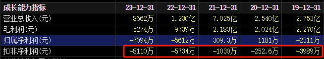 根据公司4月30日发布的2023年年报,其营业收入不足1亿元,同比下滑近30%,扣非后净利润则录得亏损近4000万元,为连续第五年亏损。深交所要求公司说明持续经营能力是否存在重大不确定性。