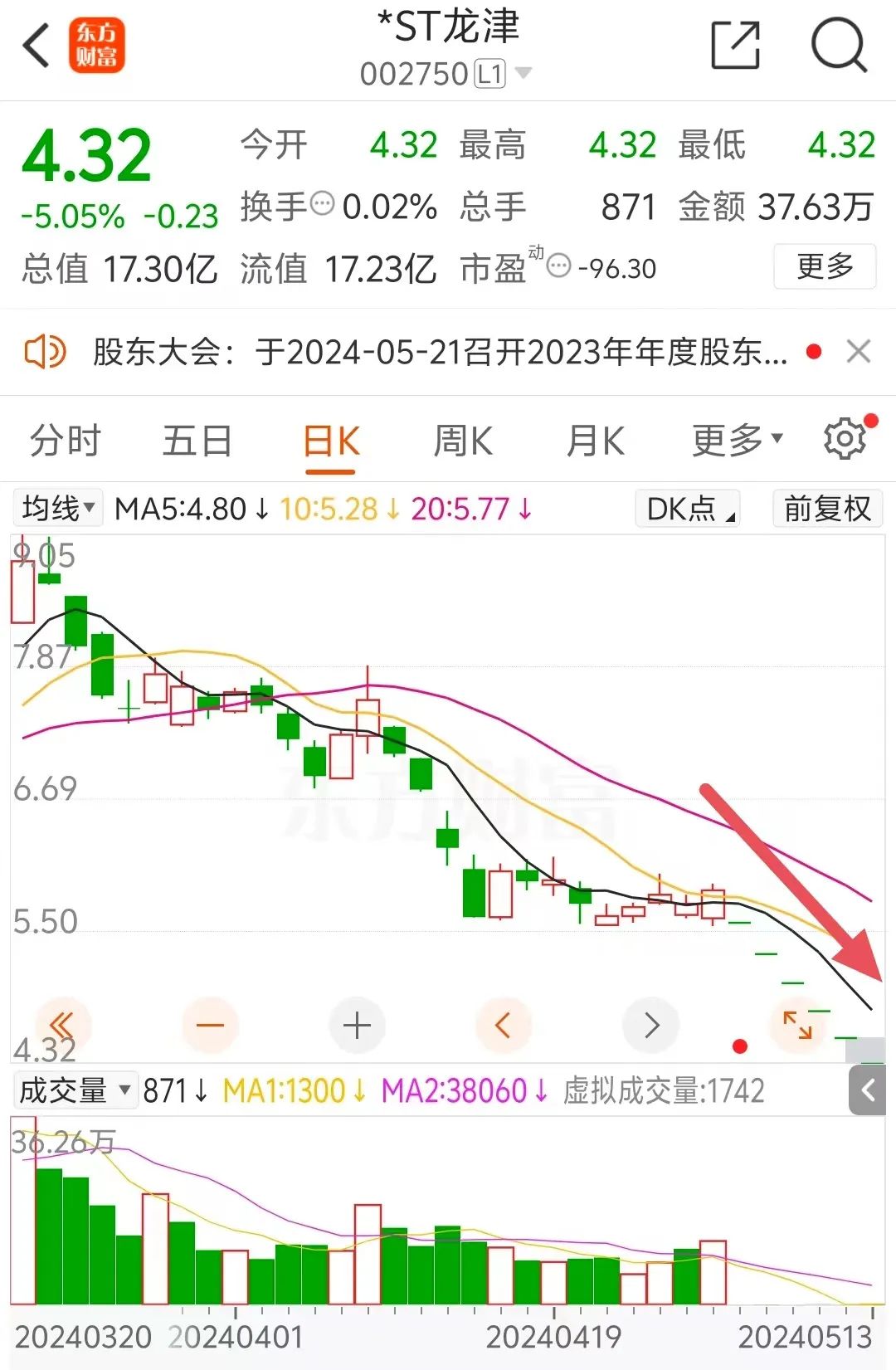 因触及深交所股票上市规则“最近一个会计年度经审计的净利润为负值且营业收入低于1 亿元”情形,龙津药业股票在5月6日已经被实施退市风险警示(即*ST),公司股价随之出现连续跌停。截至5月13日上午收盘,龙津药业已经是连续第六个交易日跌停。