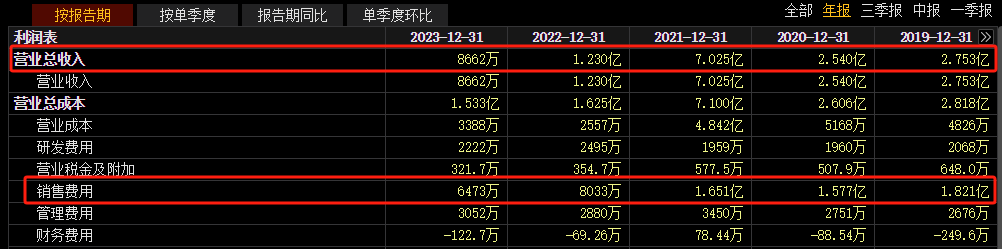 2019年到2022年,公司营业收入分别为2.75亿元、2.54亿元、7.03亿元和1.23亿元,而同期的销售费用为1.82亿元、1.58亿元、1.65亿元、8033万元,销售费用占比分别为66%、62.2%、23.5%、65.3%。