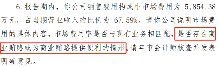 深交所要求公司说明市场费用的具体内容,市场费用率是否与现有业务相匹配,是否存在商业贿赂或为商业贿赂提供便利的情形。监管还要求年审会计师核查并发表明确意见。