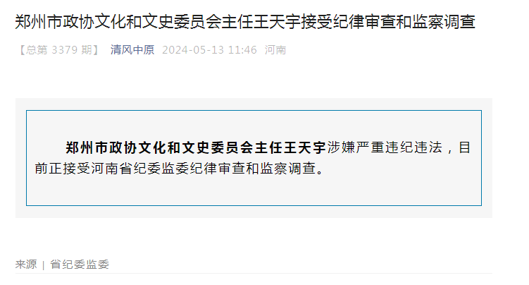 5月13日,河南省纪委监委官方微信号“清风中原”发布消息称, 郑州市政协文化和文史委员会主任王天宇涉嫌严重违纪违法,目前正接受河南省纪委监委纪律审查和监察调查。