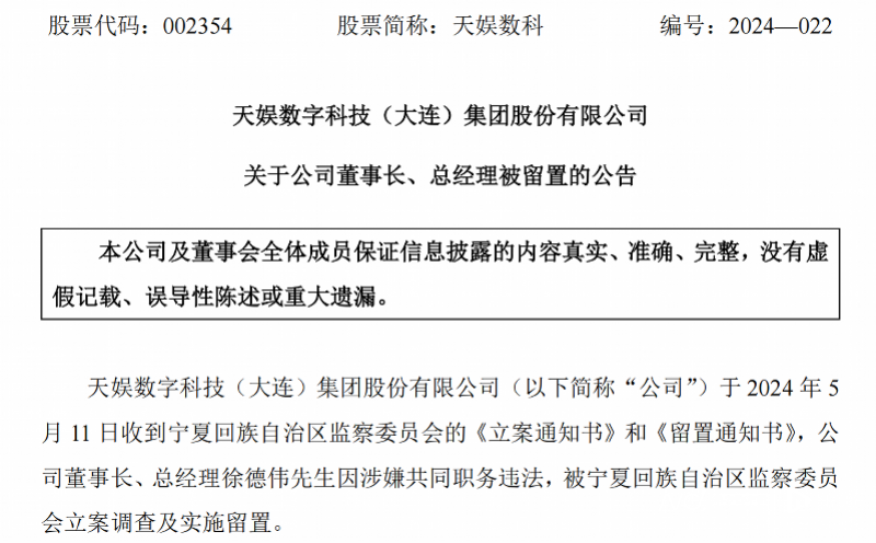 5月13日开盘,天娱数科股价一字跌停。5月12日,天娱数科发布了关于公司董事长、总经理因涉嫌共同职务违法被实施留置的公告。据悉,天娱数科董事长、总经理徐德伟因涉嫌共同职务违法,已被宁夏回族自治区监察委员会立案调查及实施留置。