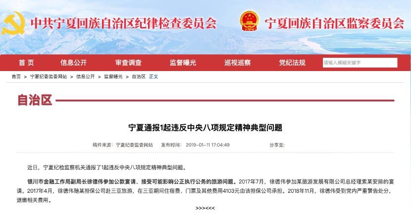 南都记者查阅宁夏纪委监委网站发现,在一篇题为《宁夏通报1起违反中央八项规定精神典型问题》的通报中提到,“银川市金融工作局副局长徐德伟参加公款宴请、接受可能影响公正执行公务的旅游问题。2017年7月,徐德伟参加某旅游发展有限公司总经理索某安排的宴请。2017年4月,徐德伟随某担保公司赴三亚旅游,在三亚期间住宿费、门票及其他费用4103元由该担保公司承担。2018年11月,徐德伟受到党内严重警告处分,退缴相关费用。”