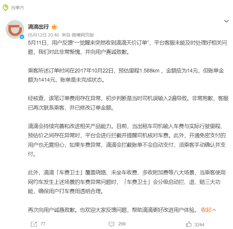 中新网5月13日电 近日,有乘客反馈“一觉醒来突然收到滴滴天价订单”。12日晚,滴滴出行对此回应,“平台客服未能及时处理好相关问题,我们对此非常惭愧,并向用户真诚致歉”。滴滴方面称,该订单时间在2017年10月22日,预估里程1.588km ,金额应为14元,但账单金额为1414元,账单是未完成状态。经核查,该笔订单费用存在异常,初步判断是当时司机误输入2遍导致。客服已再次联系乘客,并已修改订单金额。滴滴称,目前,当出租车司机输入车费与实际行驶里程、预估价之间存在异常时,平台会进行拦截并提醒司机核对车费。