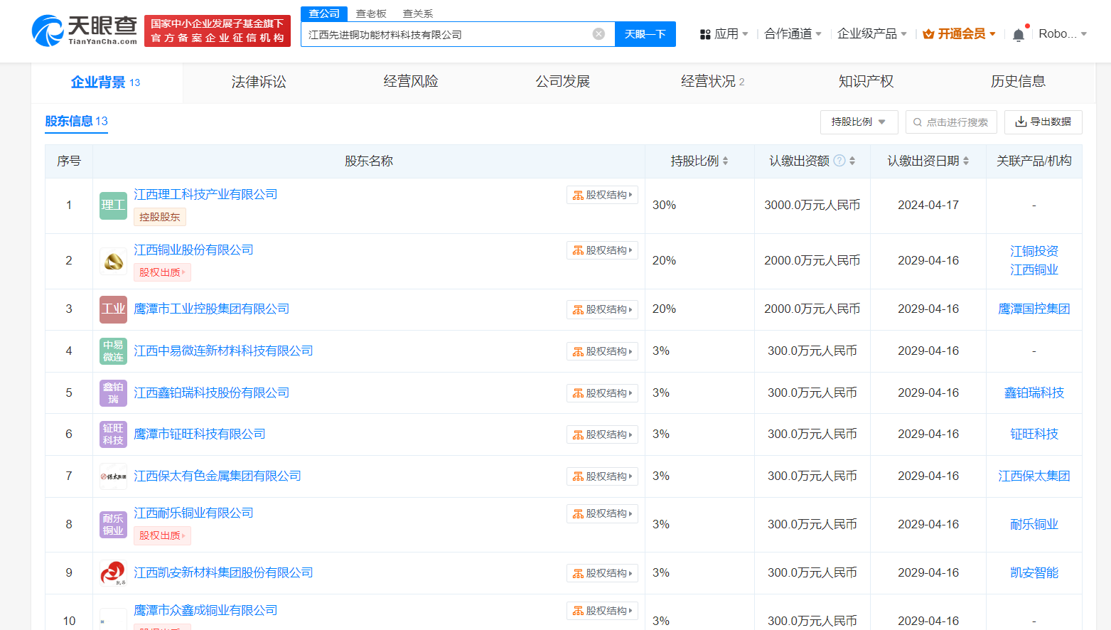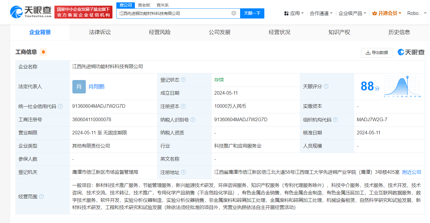 天眼查App显示,近日,江西先进铜功能材料科技有限公司成立,法定代表人为肖翔鹏,注册资本1亿人民币,经营范围含新材料技术推广服务、节能管理服务、新兴能源技术研发、环保咨询服务、知识产权服务等。股东信息显示,该公司由江西理工科技产业有限公司、江西铜业(600362)、鹰潭市工业控股集团有限公司等共同持股。