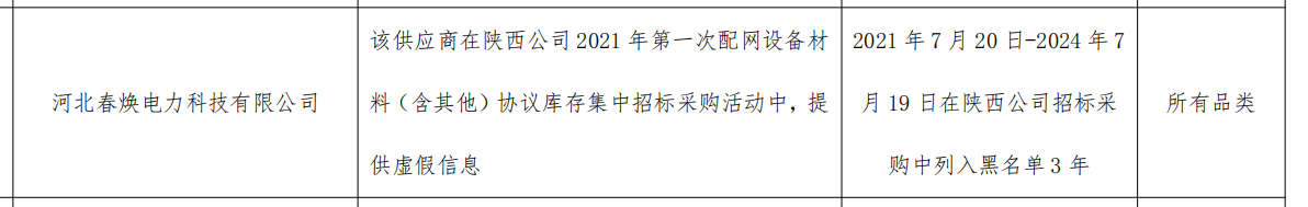 公告显示,河北春焕电力科技有限公司,该供应商在陕西公司 2021 年第一次配网设备材料(含其他)协议库存集中招标采购活动中,提供虚假信息。