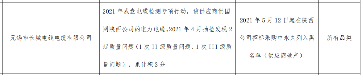 公告显示,无锡市长城电线电缆有限公司,2021 年成盘电缆检测专项行动,该供应商供国网陕西公司的电力电缆,2021 年 4 月抽检发现 2 起质量问题(1 次 II 级质量问题、1 次 III 级质量问题),累计积 3 分。