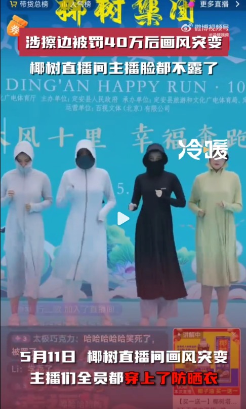 5月11日,椰树被罚40万元后直播间画风突变,模特穿防晒服直播这次捂严实了……此前回应被罚表示“担心”和“不服”。
