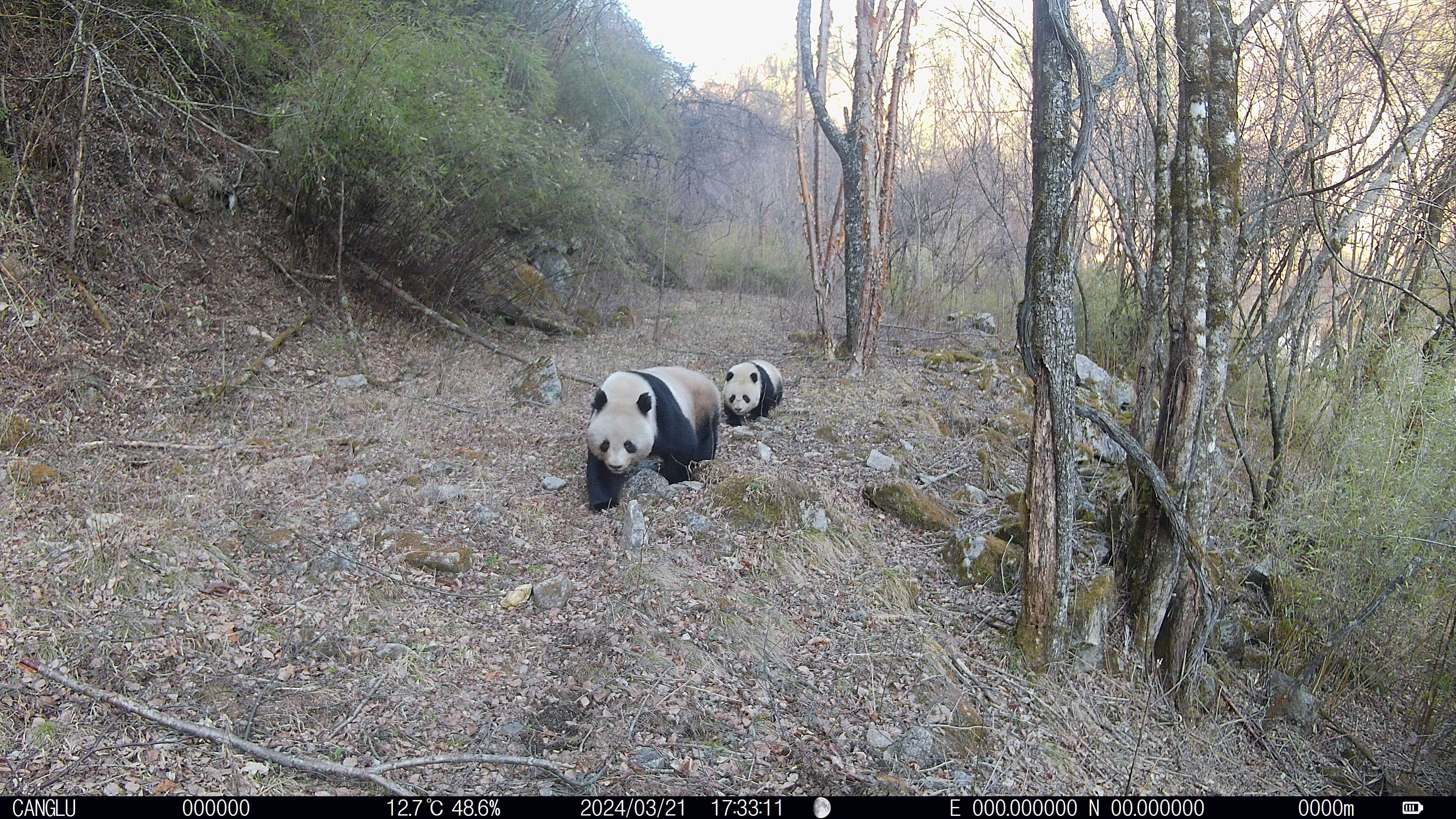 而野生大熊猫带崽的视频更是弥足珍贵。第一段视频拍摄于2024年3月21日,在海拔约2000米位置,镜头中大熊猫妈妈身形健壮,步伐从容地走在前面。幼崽娇小可爱,走起路来一颠一颠地,紧紧地跟在妈妈的身后。十几分钟后,这对母子的身影再次出现在同一条沟的另一个点位。