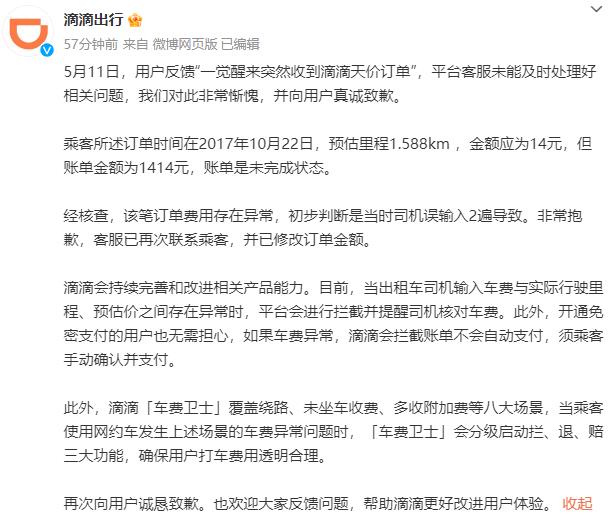 据滴滴出行官方微博消息,5月11日,用户反馈“一觉醒来突然收到滴滴天价订单”,平台客服未能及时处理好相关问题,我们对此非常惭愧,并向用户真诚致歉。