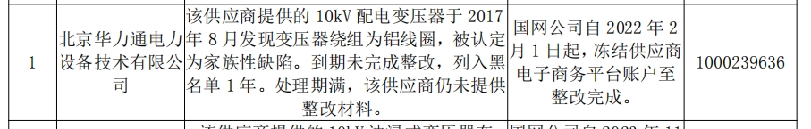 其中,北京华力通电力设备技术有限公司提供的 10kV 配电变压器于 2017 年 8 月发现变压器绕组为铝线圈,被认定为。到期未完成整改,列入黑名单 1 年。处理期满,该供应商仍未提供整改材料。处理措施:国网公司自 2022 年 2 月 1 日起,冻结供应商电子商务平台账户至整改完成。供应商编码:1000239636。