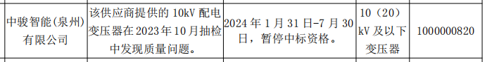 公告显示,中骏智能(泉州)有限公司,该供应商提供的 10kV 配电变压器在 2023年 10 月抽检中发现质量问题。