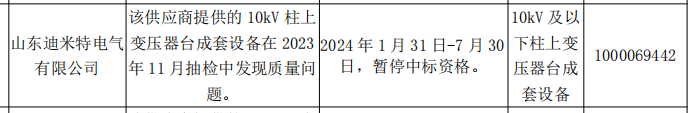 公告显示,山东迪米特电气有限公司,该供应商提供的 10kV 柱上变压器台成套设备在 2023 年 11 月抽检中发现质量问题。