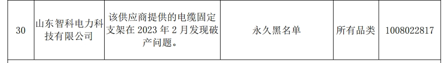 其中,山东智科电力科技有限公司提供的电缆固定支架在2023年2月发现破产问题。处理措施:永久黑名单。处理范围:所有品类。供应商编码:1008022817。
