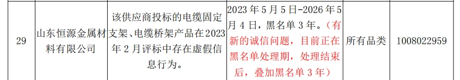 其中,山东恒源金属材料有限公司投标的电缆固定支架、电缆桥架产品在2023年2月评标中存在虚假信息行为。处理措施:2023年5月5日-2026年5月4日,黑名单3年。(有新的诚信问题,目前正在黑名单处理期,处理结束后,叠加黑名单3年)。处理范围:所有品类。供应商编码:1008022959。