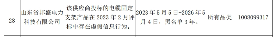 其中,山东省邦盛电力科技有限公司投标的电缆固定支架产品在2023年2月评标中存在虚假信息行为。处理措施:2023年5月5日-2026年5月4日,黑名单3年。处理范围:所有品类。供应商编码:1008099317。