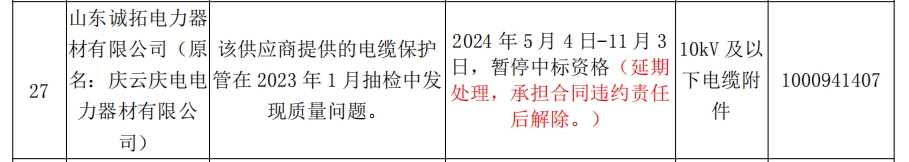 其中,山东诚拓电力器材有限公司(原名称:庆云庆电电力器材有限公司)提供的电缆保护管在2023年1月抽检中发现质量问题。处理措施:2024年5月4日-11月3日,暂停中标资格。处理范围:10kV及以下电缆附件。供应商编码:1000941407。