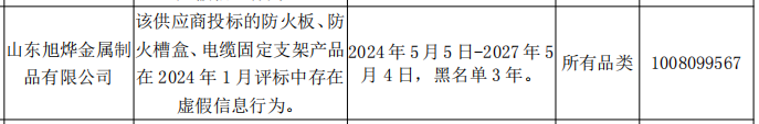 公告显示,山东旭烨金属制品有限公司,该供应商投标的防火板、防火槽盒、电缆固定支架产品 在 2024 年 1 月评标中存在虚假信息行为。