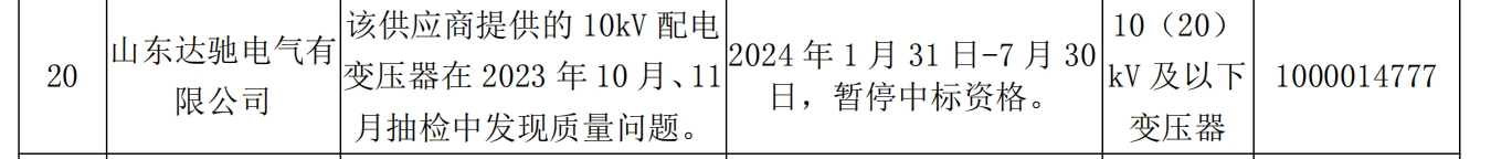 其中,山东达驰电气有限公司提供的10kV配电变压器在2023年10月、11月抽检中发现质量问题。处理措施:2024年1月31日-7月30日,暂停中标资格。处理范围:10kV及以下变压器。供应商编码:1000014777。