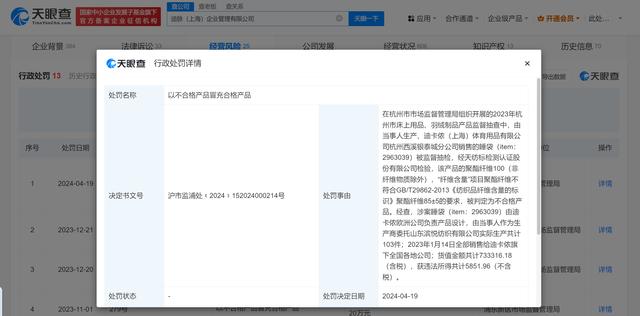 天眼查经营风险信息显示,近日,迪脉(上海)企业管理有限公司因以不合格产品冒充合格产品,被浦东新区市场监督管理局罚款3.6万余元、没收违法所得5851.96元。处罚事由显示,经检验,由当事人生产、迪卡侬(上海)体育用品有限公司杭州西溪银泰城分公司销售的睡袋聚酯纤维含量不符合要求,被判定为不合格产品。经查,涉案睡袋共生产103件,货值金额73万余元。