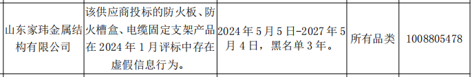 公告显示,山东家玮金属结构有限公司,该供应商投标的防火板、防火槽盒、电缆固定支架产品在 2024 年 1 月评标中存在虚假信息行为。