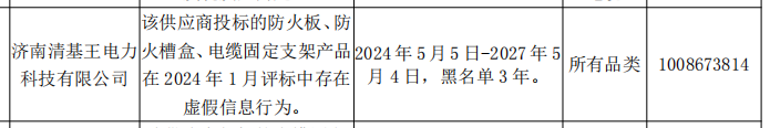 公告显示,济南清基王电力科技有限公司,该供应商投标的防火板、防火槽盒、电缆固定支架产品在 2024 年 1 月评标中存在虚假信息行为。