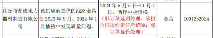 相关处理措施为,2024 年 5 月 5 日-11 月 4 日,暂停中标资格 (旧订单延期处理,承担合同违约责任后解除;新订单延长处理)。处理范围为,金具。供应商编码为1001232024。