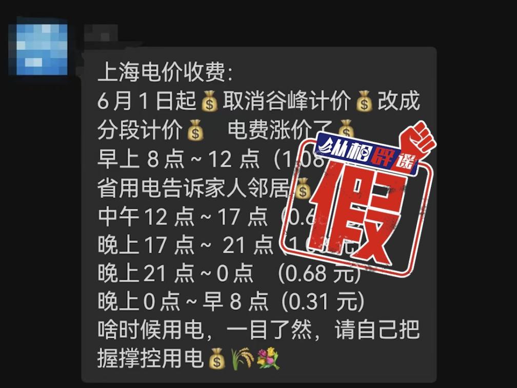 近日,一段“上海6月1日起取消谷峰计价,改成分段计价”的电费涨价内容在社交媒体平台传播。今天(5月11日),东方网·纵相新闻记者从国家电网95598服务热线了解到,上海市电力公司近期没有收到政府部门对于电价调整的相关通知,“上海居民电价没有涨价或者变动,还是和之前一样。”