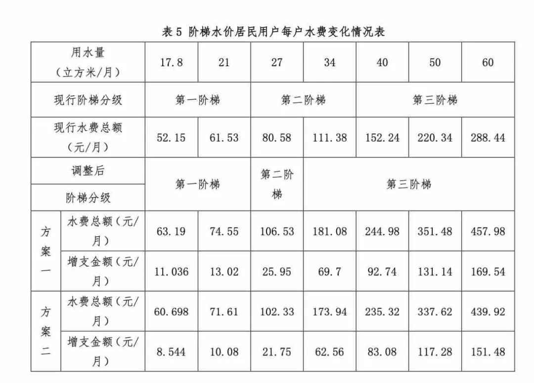 具体来看,方案一为:居民生活用水三个阶梯水价分别为2.60元/立方米、3.90元/立方米、7.80元/立方米;居民合表水价2.86元/立方米,非居民生活用水价格4.56元/立方米,特种用水价格25元/立方米。