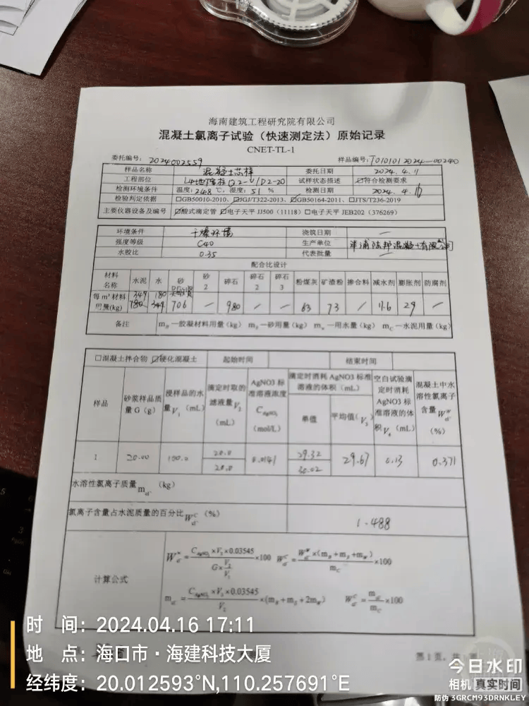 2、 检测报告:水泥氯离子含量超标近5倍