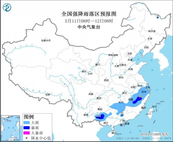 预计,5月11日08时至12日08时,湖南中南部、江西中北部、福建西部、浙江大部、广西西部和东北部、广东北部、安徽东南部、上海及黑龙江北部等地部分地区有大到暴雨,其中,浙江西南部、福建西北部、广西西南部等地局地有大暴雨(100~110毫米)。上述部分地区伴有短时强降水(最大小时降雨量20~50毫米,局地可超过70毫米),局地有雷暴大风或冰雹等强对流天气。中央气象台5月11日06时继续发布暴雨蓝色预警。