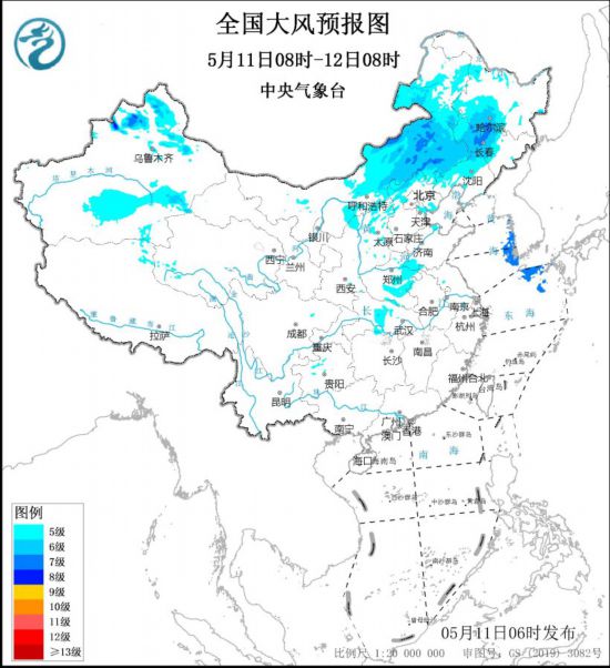 预计,5月11日08时至12日08时,内蒙古中东部、黑龙江中西部、吉林中西部、辽宁中西部、新疆北部和南疆盆地、山西北部、河北北部、天津、河南东部等地有5~7级、阵风8~10级的大风;新疆南部、内蒙古中东部、华北北部等地有沙尘天气。我国近海海域无8级及以上海上大风出现。中央气象台5月11日06时继续发布大风蓝色预警。