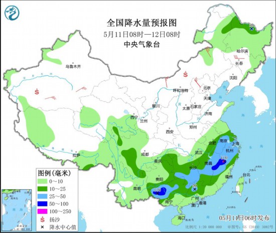 5月11日08时至12日08时,黑龙江西北部、内蒙古东北部、四川盆地西部、西南地区东南部、江淮东部、江南大部、华南北部和西部等地部分地区有中到大雨,其中,江西东北部、浙江西南部、福建西北部、云南东南部、广西西部等地部分地区有暴雨或大暴雨(100~110毫米);西藏东部、青海中南部、川西高原等地有小到中雪或雨夹雪,其中青海东南部、川西高原西部等地局地有大到暴雪。内蒙古西北部、吉林中部、新疆南部、河北北部等地部分地区有4~6级风,其中,内蒙古中部部分地区有6~7级风;新疆南部、内蒙古中东部、华北等地有沙尘天气。